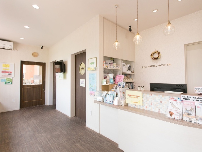 受付と待合室です。奥には猫ちゃん専用の待合室がございます。当院自慢のスタッフたちが美味しいオヤツを置いたり季節の飾りつけをして、お待ちいただく時間を少しでも快適に過ごしていただけるように努めています。